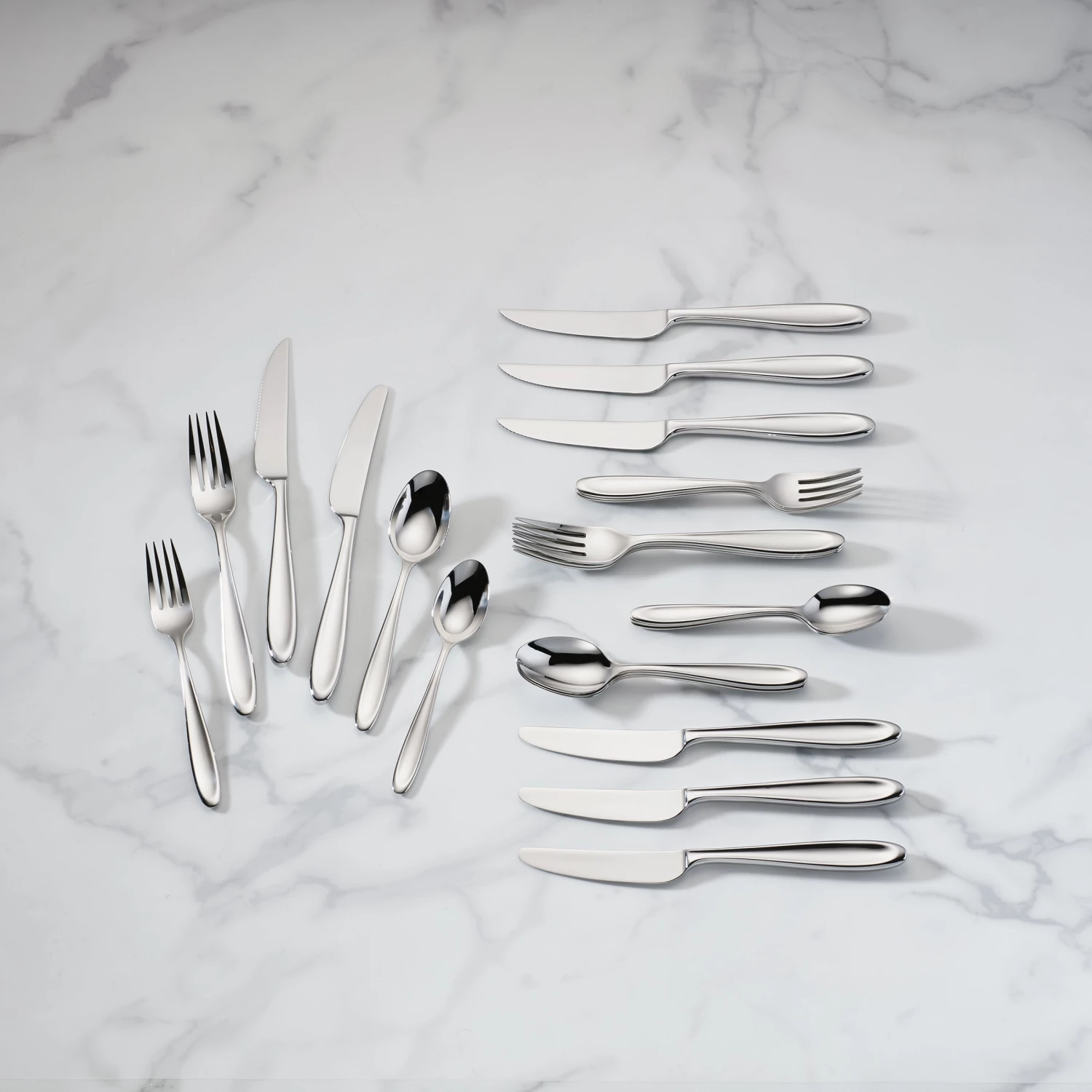 The regal and pristine Cantera 24-piece flatware set is crafted of durable 18/10 stainless steel. This elaborate and dishwasher-safe silverware set includes four steak knives, four salad forks, four dinner forks, four teaspoons, four dinner spoons and four dinner knives.