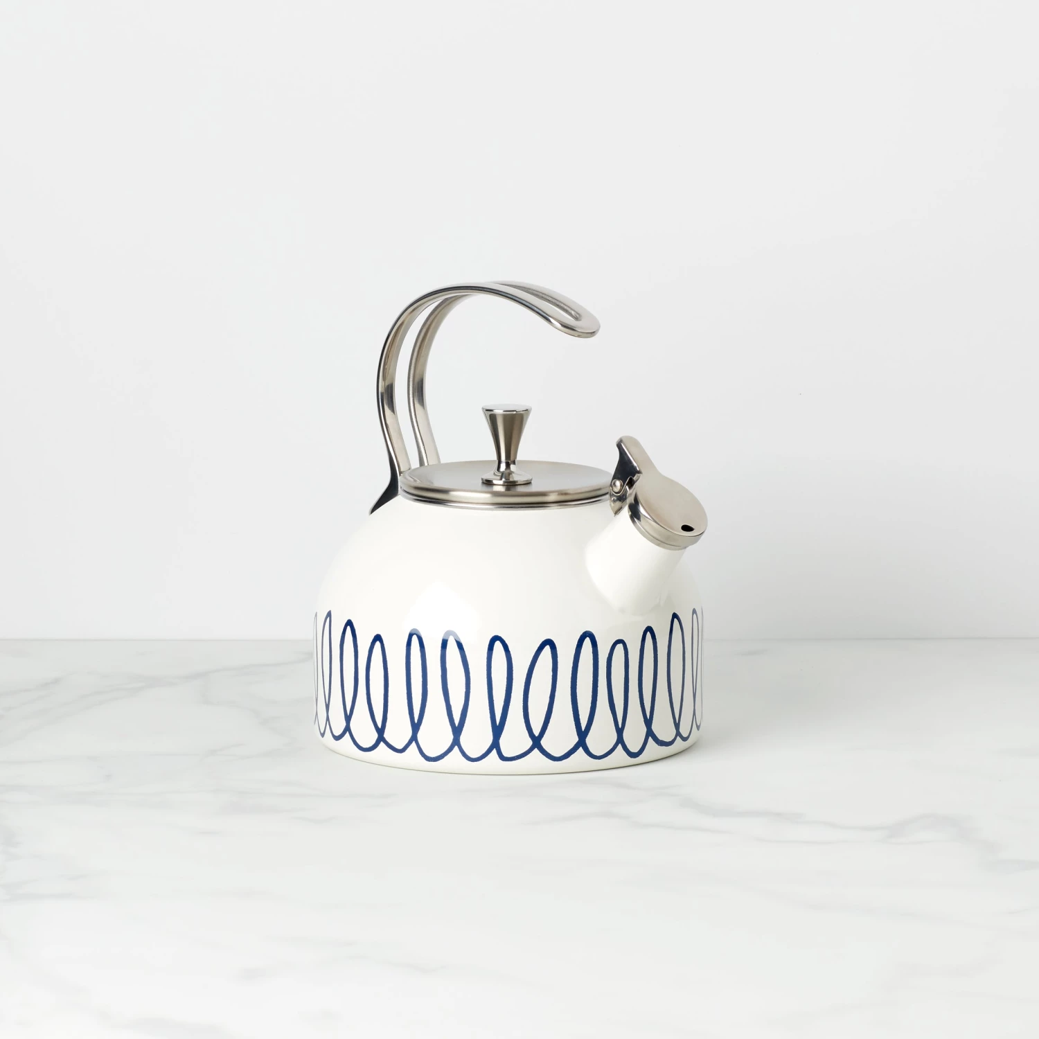 This charming Kate Spade New York tea kettle features hand-drawn loop-di-loops for a carefree design that livens up your kitchen counter. Inspired by the historic London street, the Charlotte Street West pattern mixes cosmopolitan vibes with versatile elegance.