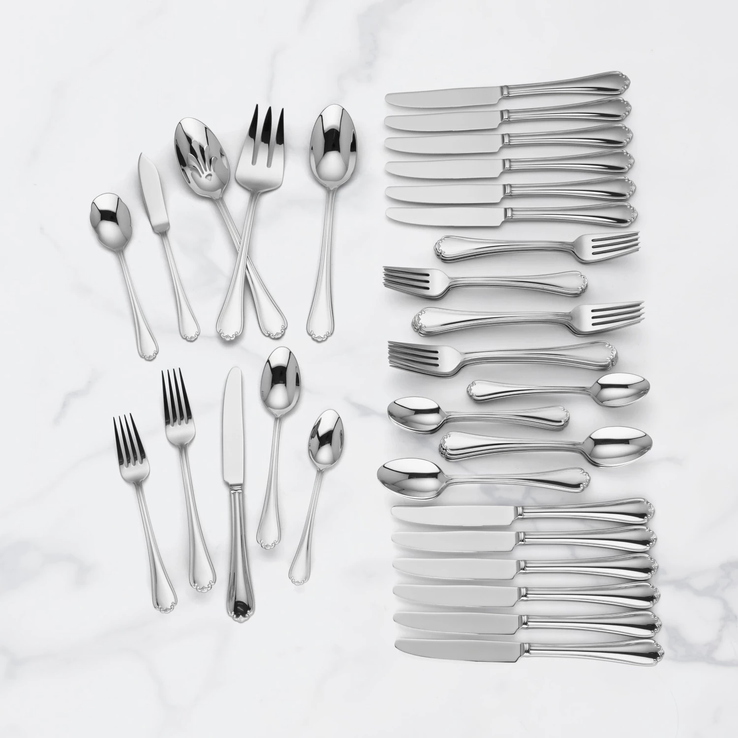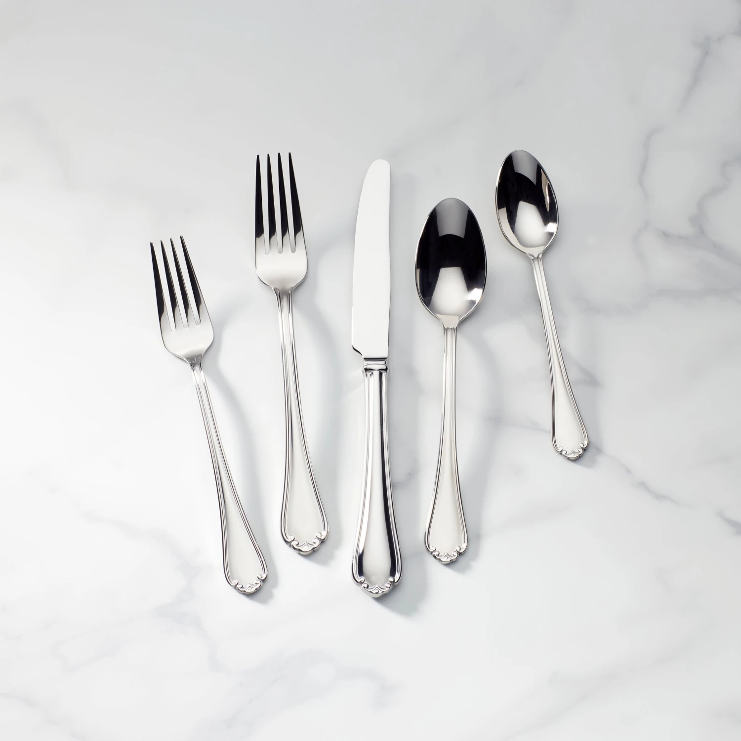 The Chelse Muse flatware set features a scalloped design along the bottom of the handle, inspired by floral motifs. Crafted from brilliant 18/10 stainless steel, this high quality flatware set is both durable and dishwasher safe, making it ideal for everyday use. This large set has everything you need in one and can be used for both casual and formal occasions.