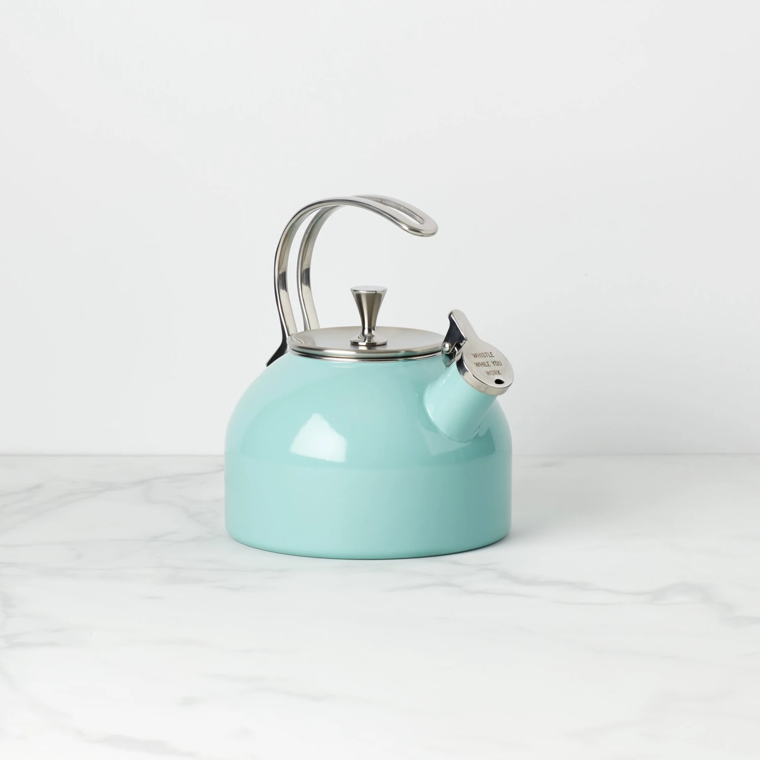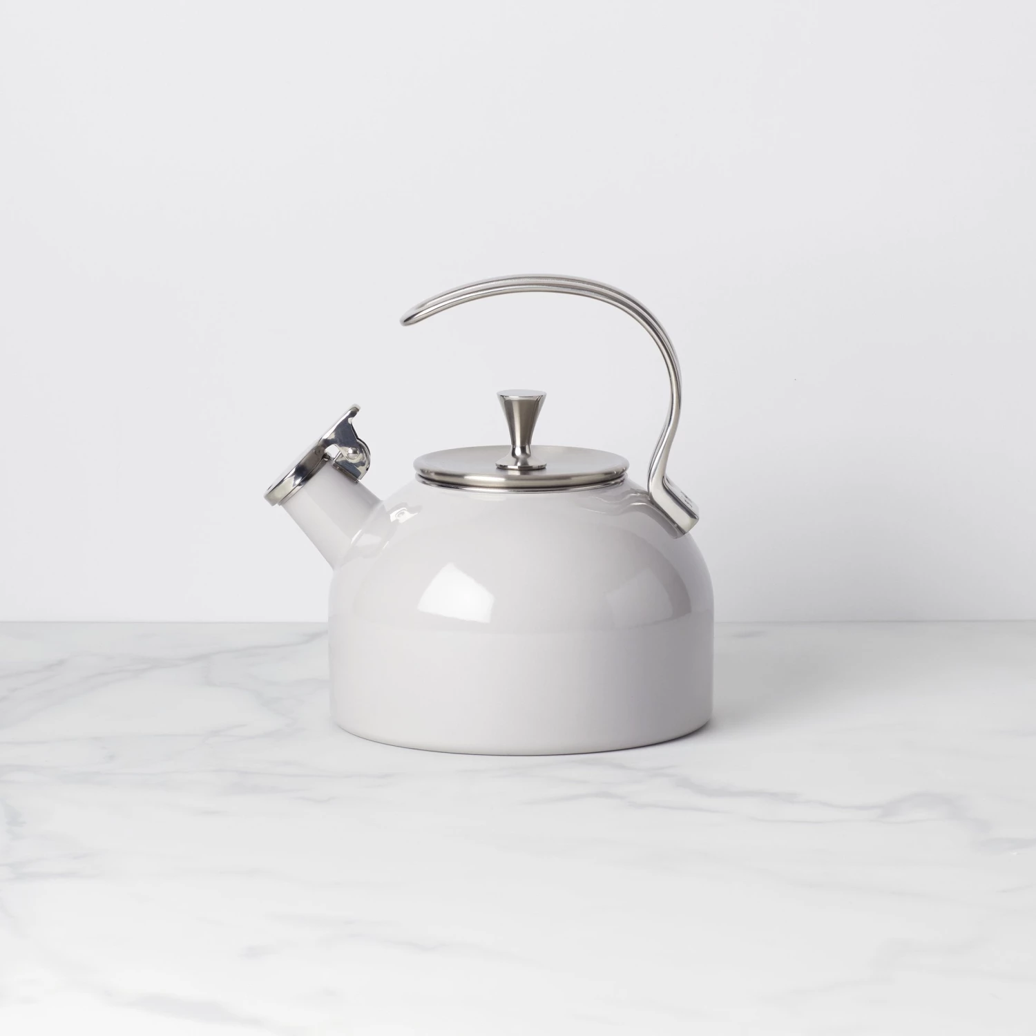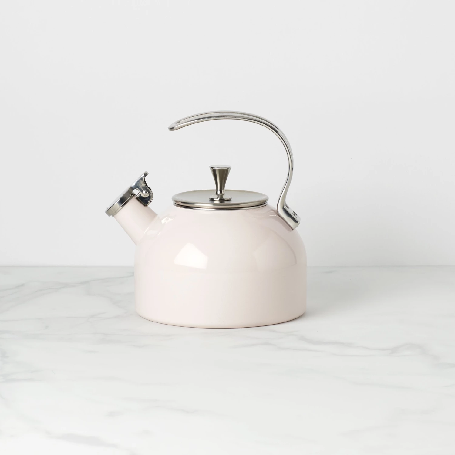 Sip and serve in style with this sleek tea kettle from Kate Spade New York. The polished enamel surface delivers a healthy dose of classic charm that you love. The bonus? It features a cute little “Whistle While You Work” message at the spout for a bit of cheeky fun.