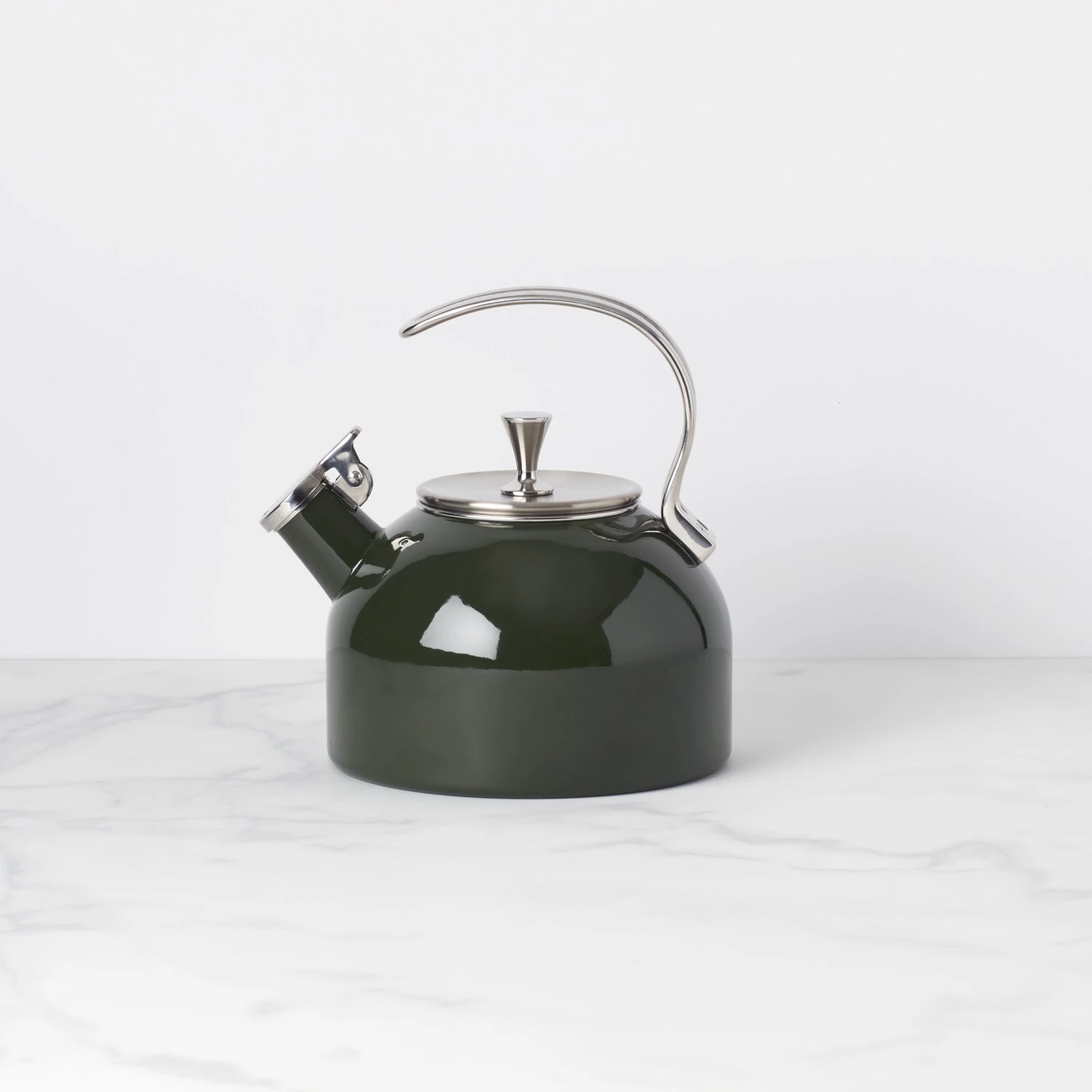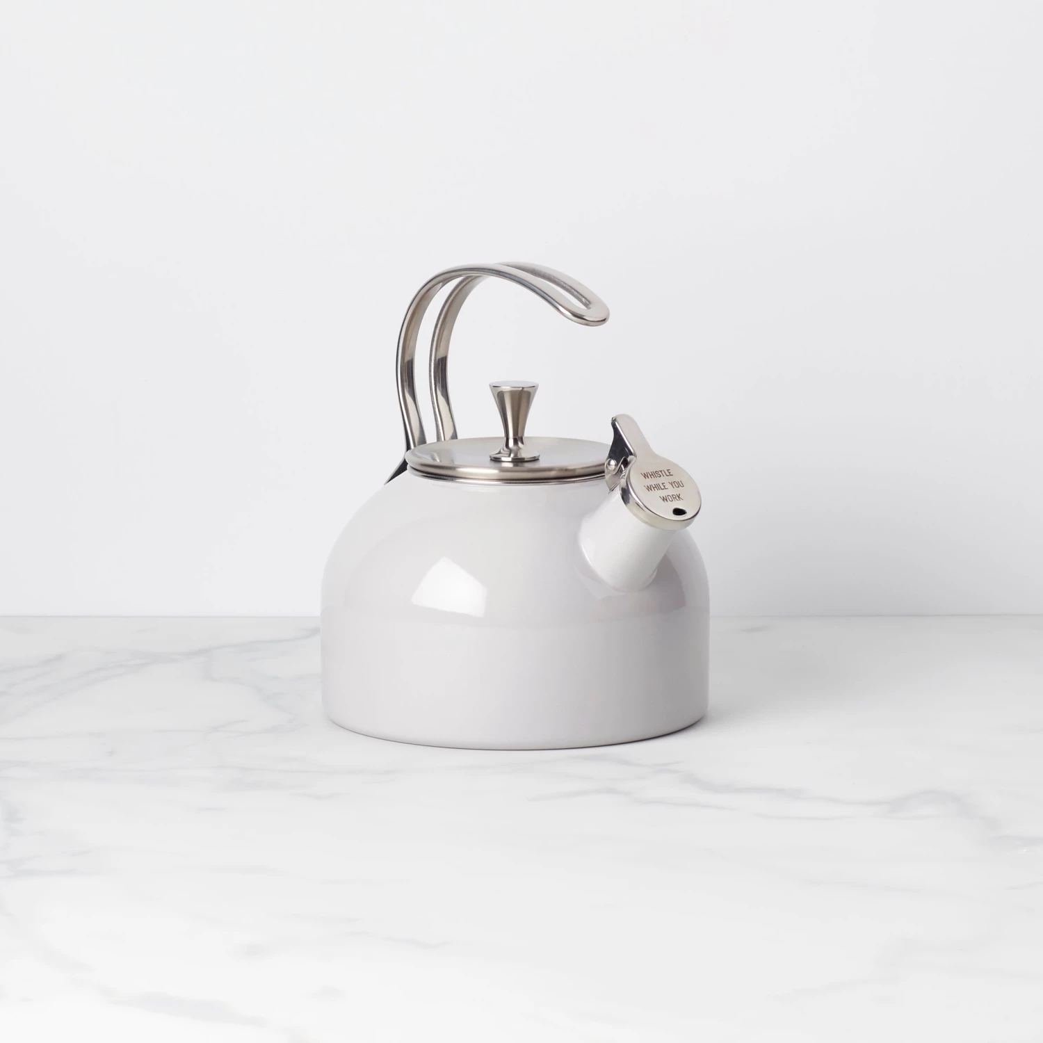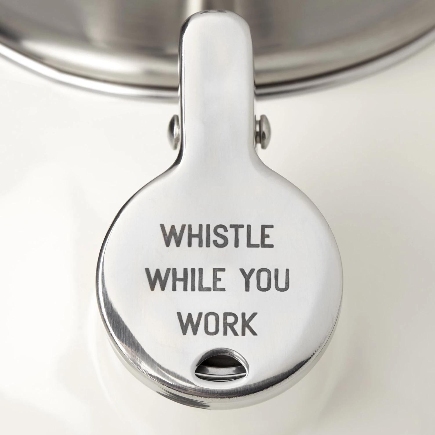 Sip and serve in style with this sleek tea kettle from Kate Spade New York. The polished enamel surface delivers a healthy dose of classic charm that you love. The bonus? It features a cute little “Whistle While You Work” message at the spout for a bit of cheeky fun.