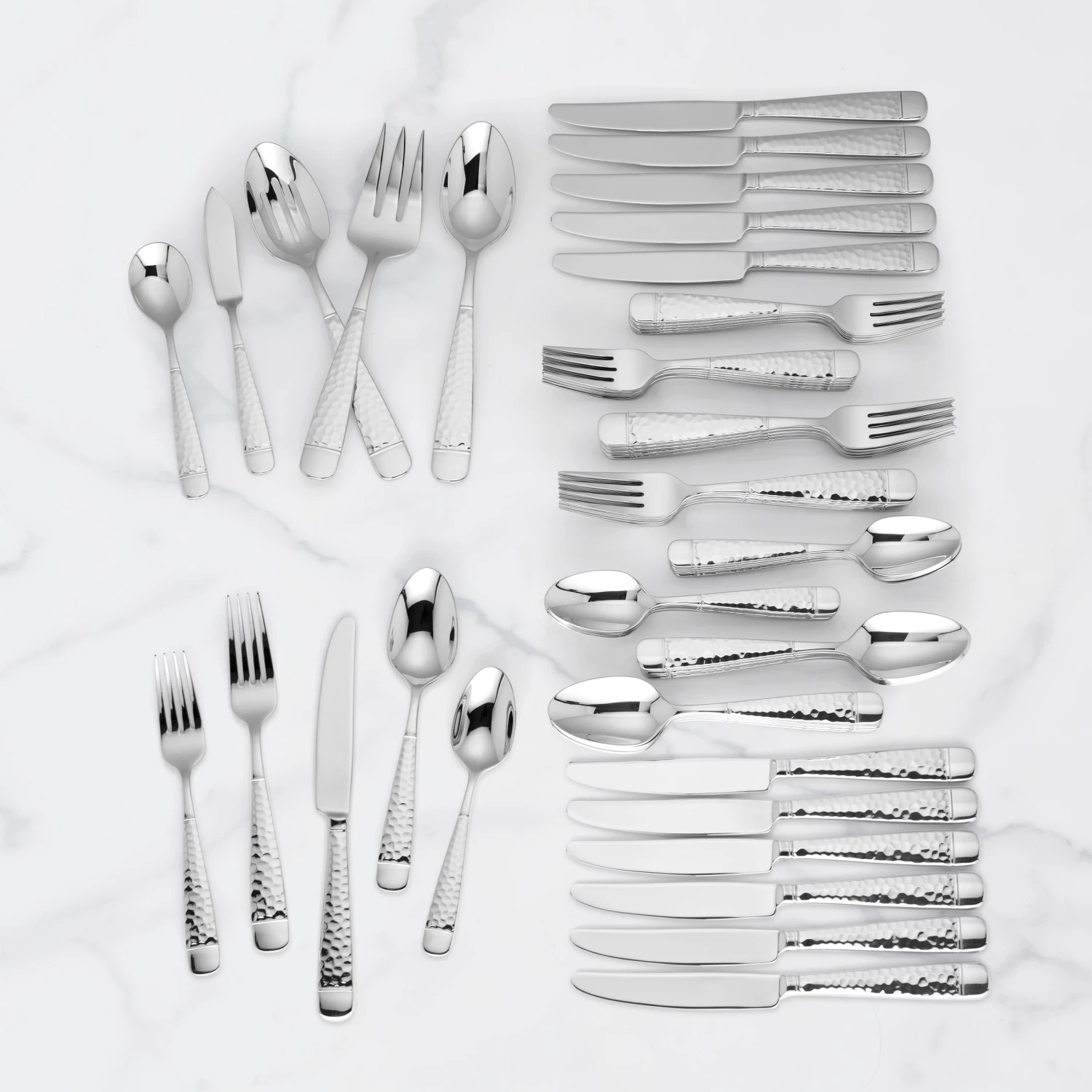 The Eastwood flatware set features an elegant, hammered finish on the handle. Crafted from brilliant 18/10 stainless steel, this high quality flatware set is both durable and dishwasher safe, making it ideal for everyday use. This large set has everything you need in one and can be used for both casual and formal occasions.
