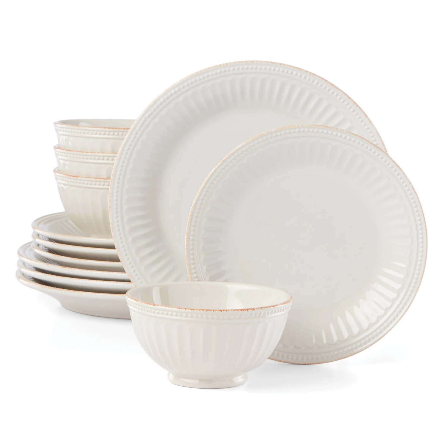 Thick grooves and petite beads are the central focus of this 12-piece dinnerware set. Crafted in durable stoneware, it features a subtle, hand-applied tea-stain along the edge for a hint of rustic charm. Plus, each piece is both microwave and dishwasher safe for added convenience.