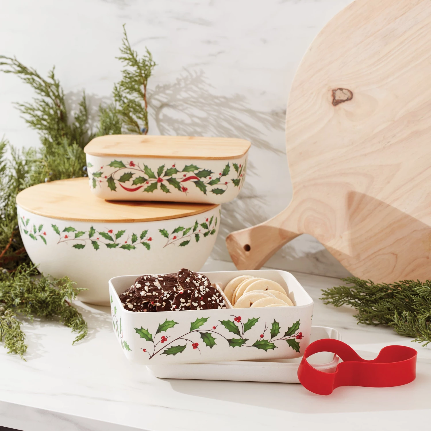 Take your holiday treats on the go with this festive bamboo bowl and lid. Featuring holly leaf motifs crafted with seasonal spirit on a snowy white base.