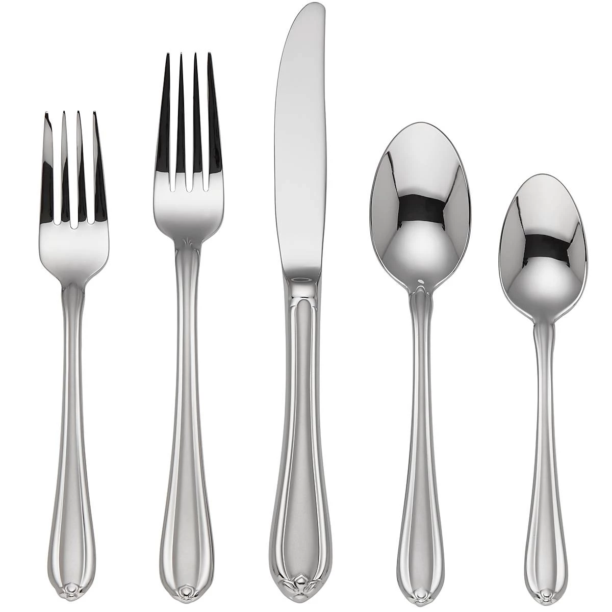 An elegant leaf texture graces the terminal of each handle, with a curving vertical groove that distinguishes this design, by Gorham. From the Formal Stainless Collection, the Melon Bud Frosted 5-piece Place Setting is made from dishwasher-safe 18/10 stainless steel, and includes a dinner fork, dinner knife, salad fork, tablespoon, and teaspoon.