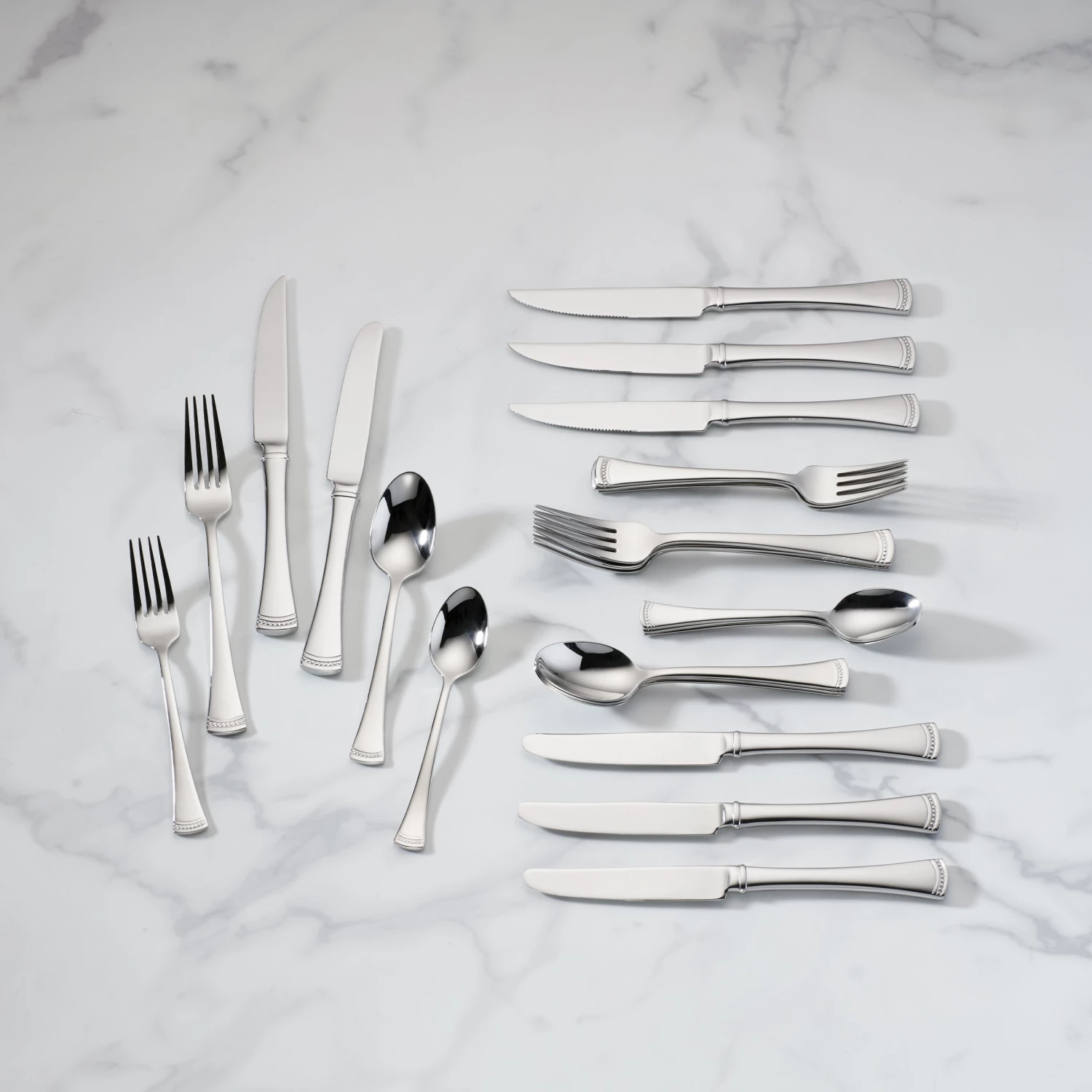 The Colington Creek 24-piece flatware set features flared handles with a beaded channel at each base. Crafted from brilliant 18/10 stainless steel, this elaborate silverware set includes four of everything: forks, salad forks, knives, steak knives, spoons and teaspoons.