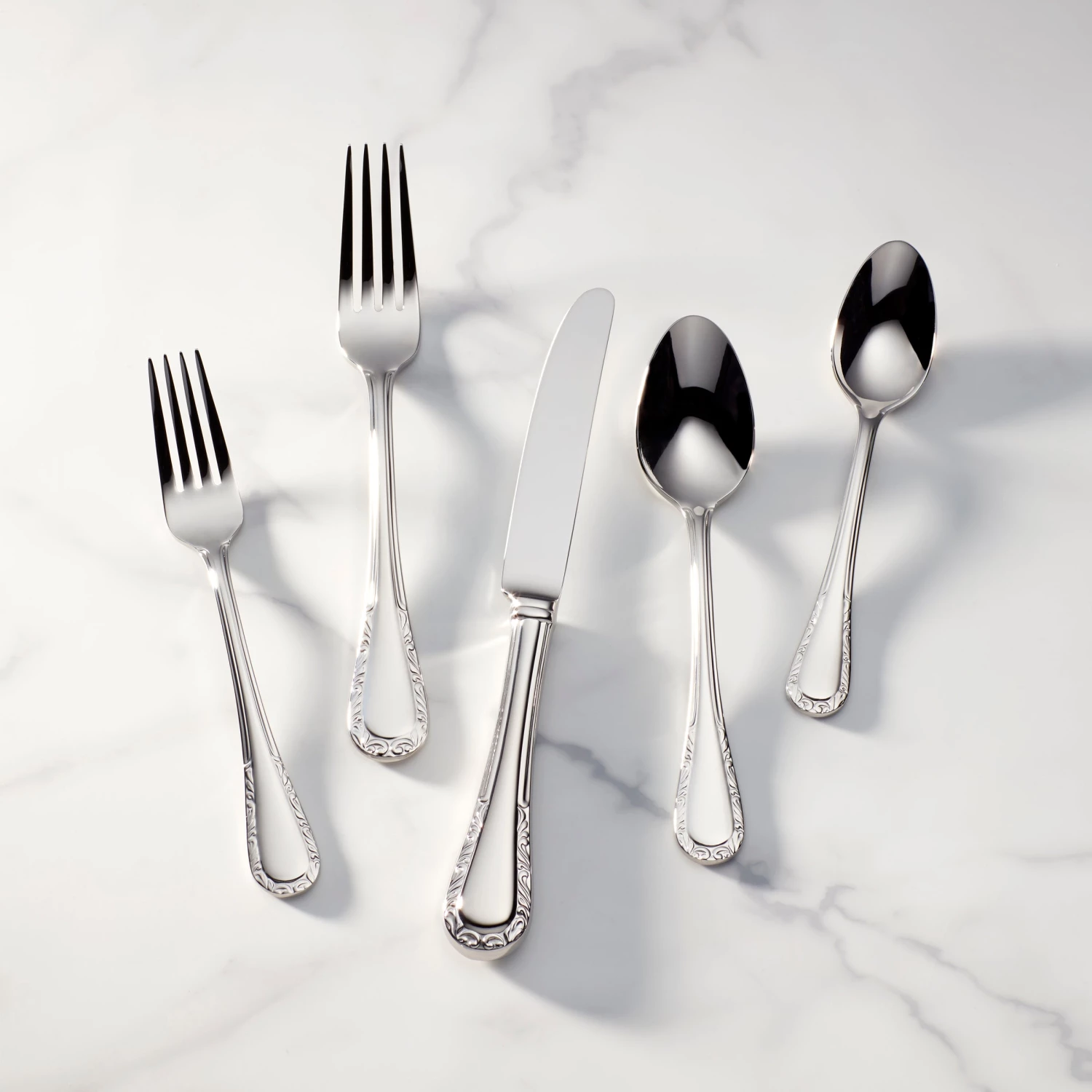 Stylish and function, the Venetian Lace 5-piece Place Setting is crafted of durable 18/10 stainless steel. This elegant set is dishwasher-safe, and includes a dinner fork, salad fork, dinner knife, tablespoon, and teaspoon.